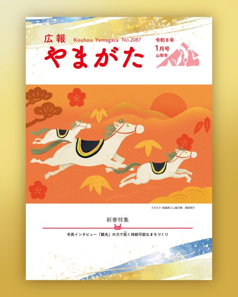 【広報誌表紙】広報やまがた令和8年1月号 広報やまがた令和8年1月号 / 山形市役所(2025) 自治体の発行する広報誌の表紙イラストレーションを担当しました。 蔵王連峰から初日の出がのぼる様子と駆け抜ける馬を生き生きと描きました。